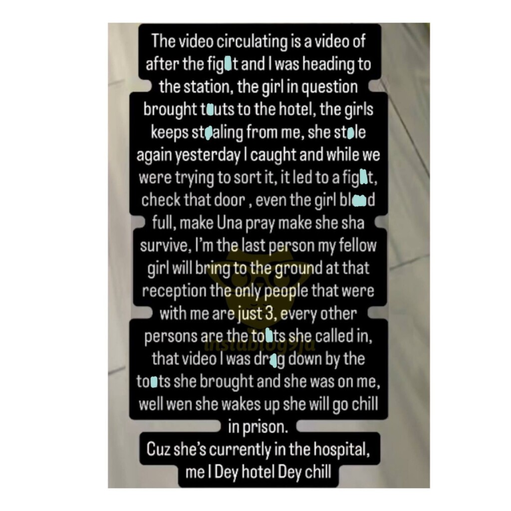 Claiming the woman involved was hospitalised, she added: “I was attacked from behind on my way out. Dem even crop the video just to twist story say dem beat me. Make una rest!