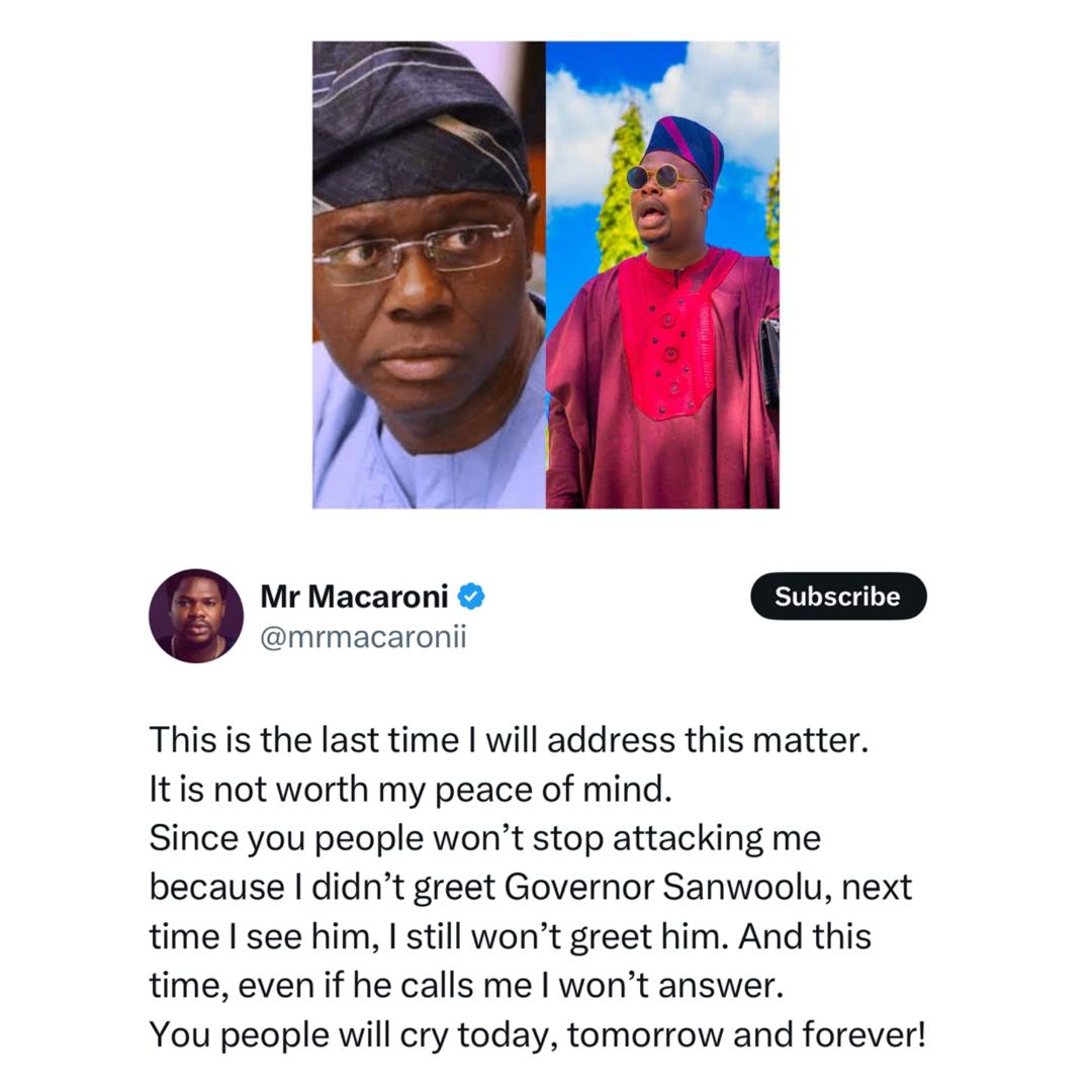 It is not worth my peace of mind. Since you people won’t stop attacking me because I didn’t greet Governor Sanwoolu, next time I see him, I still won’t greet him. And this time, even if he calls me I won’t answer. You people will cry today, tomorrow and forever!”