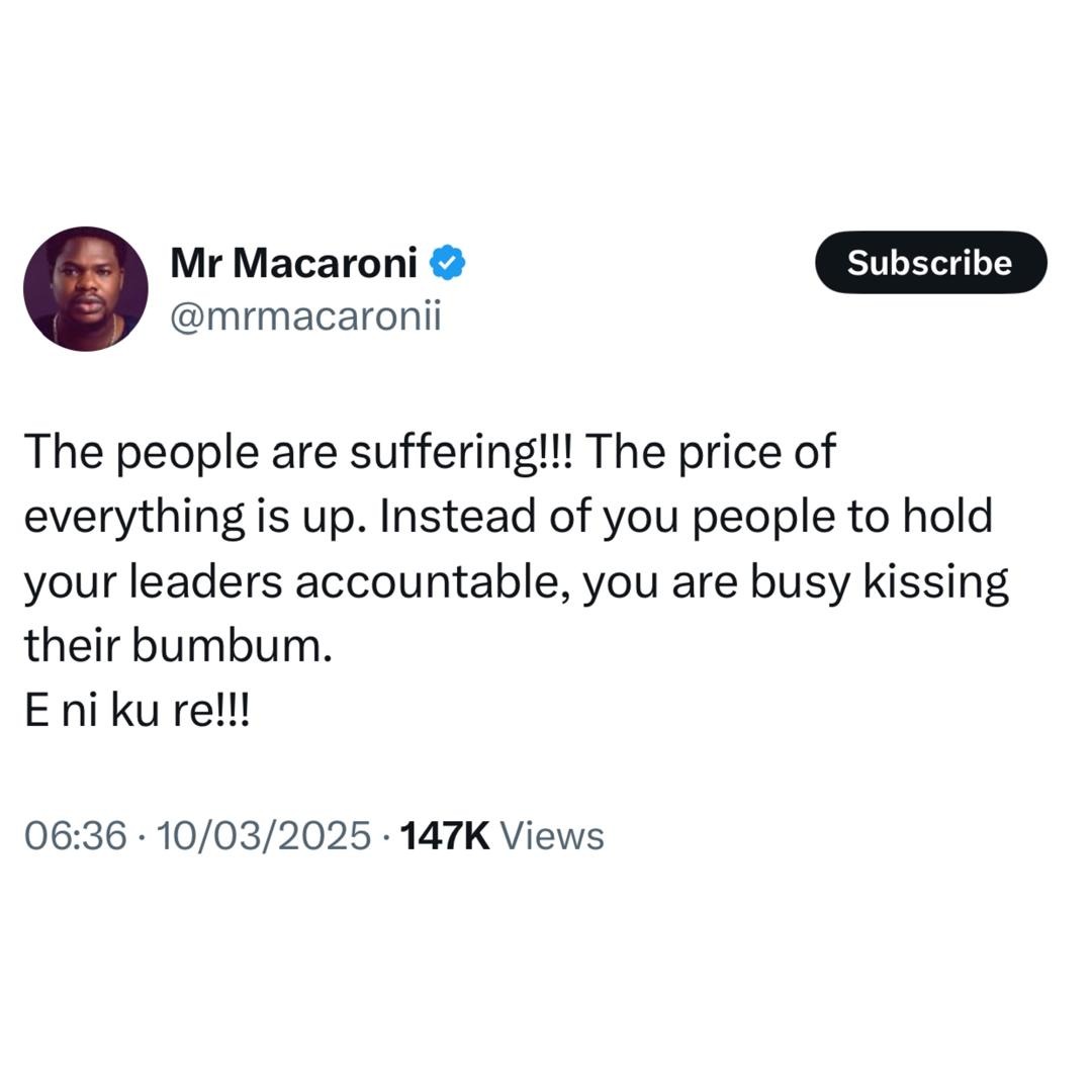 His remarks have drawn mixed reactions, with some Nigerians applauding his defiance as a stand against alleged government impunity, while others criticised him for being disrespectful.
