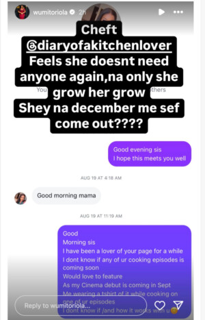 Taking to her Instagram story, Toriola recounted how she had reached out to the food influencer in August last year, requesting to feature on one of her cooking episodes as part of the promotional campaign for her cinema debut.